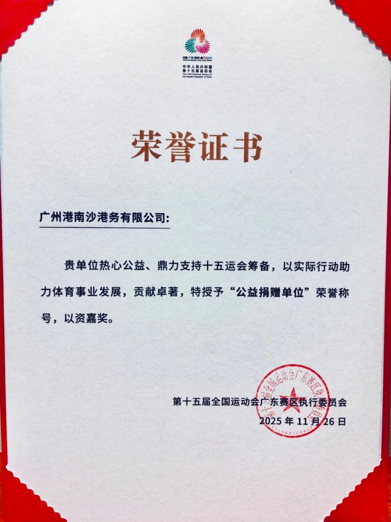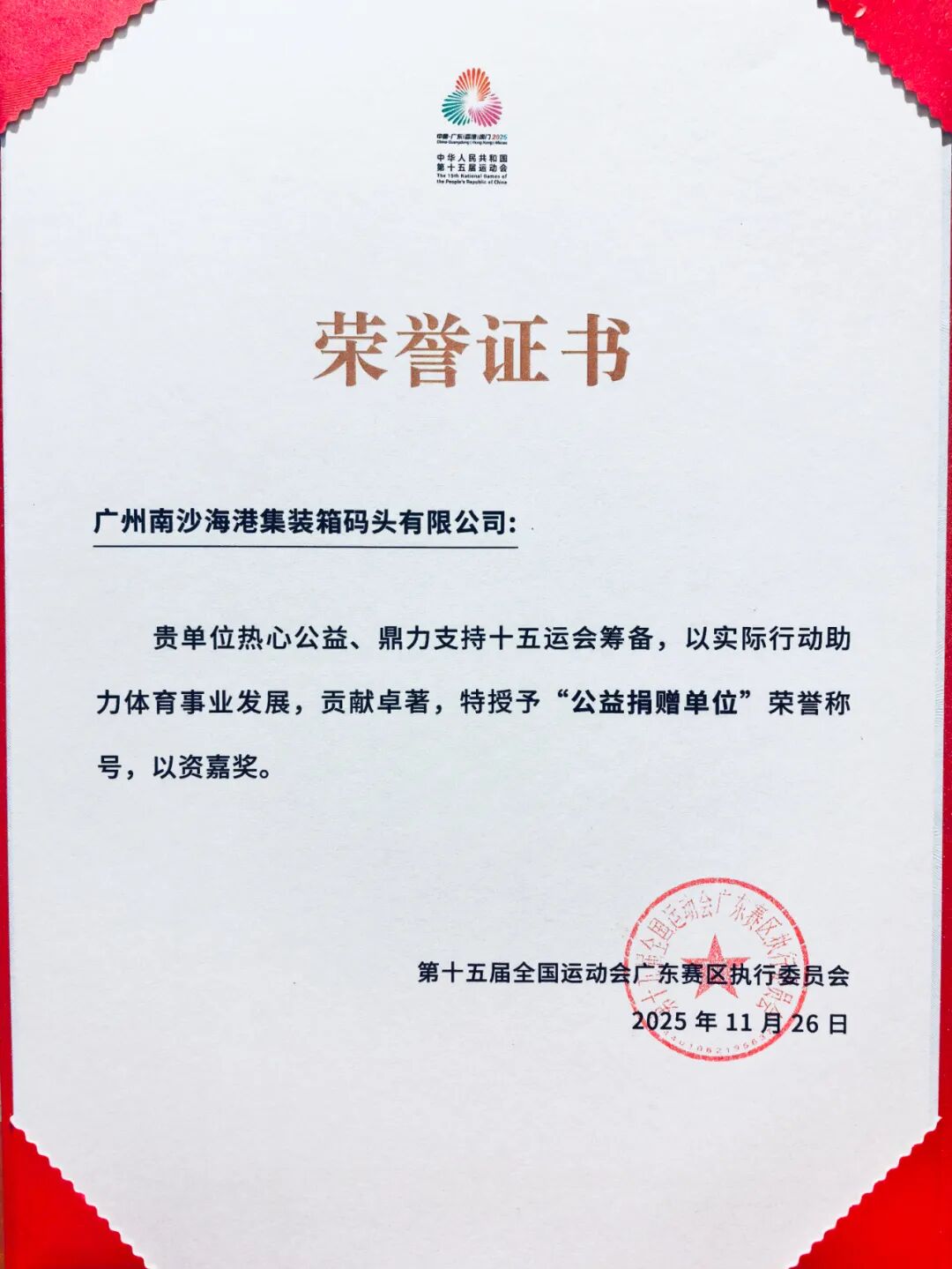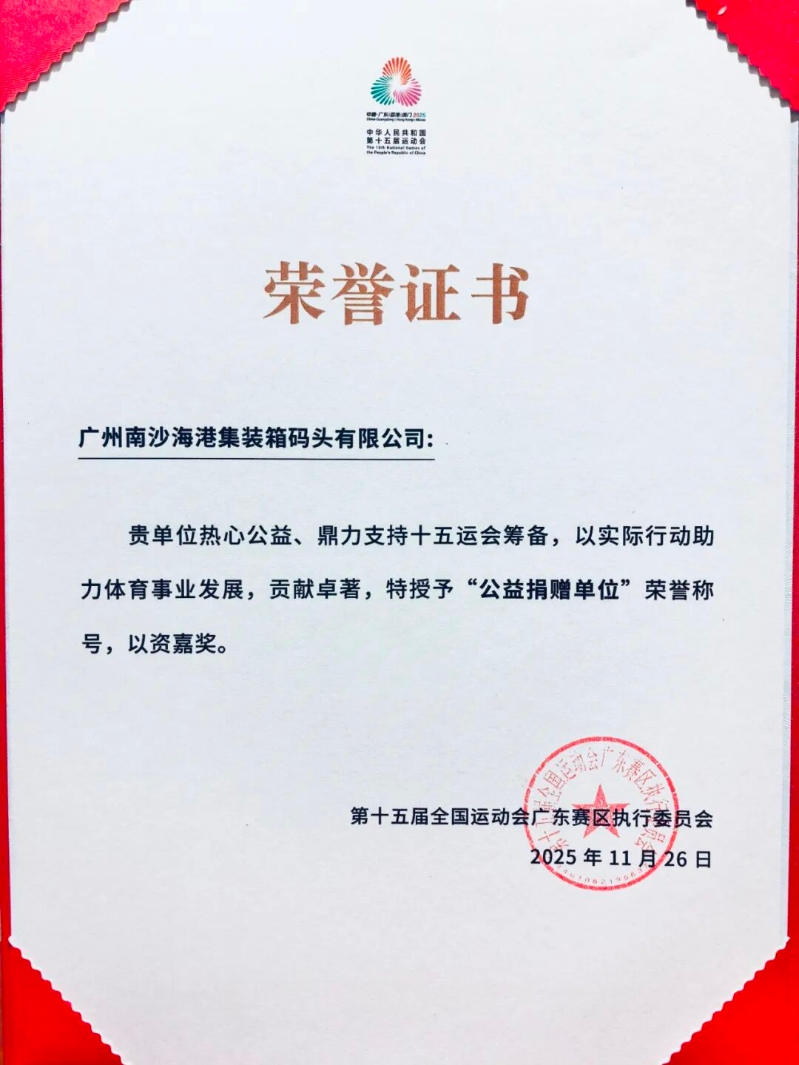 11月26日,第十五届全国运动会广州赛区在广州塔举办了“大爱湾区,共创未来”公益捐赠仪式。广州港南沙港务有限公司和广州南沙海港集装箱有限公司作为深度参与粤港澳大湾区绿色发展重点用能单位,应邀出席仪式,并分别在现场捐赠了3799 吨二氧化碳排放量,以实际行动为十五运注入绿色动能,践行“双碳”战略下企业社会责任与使命。